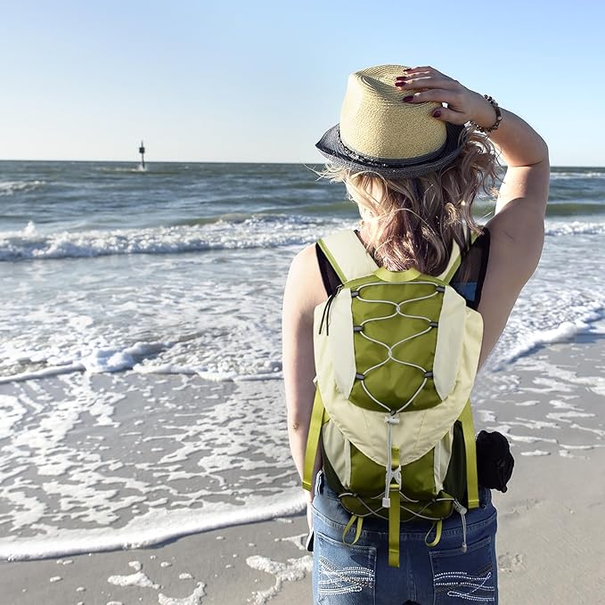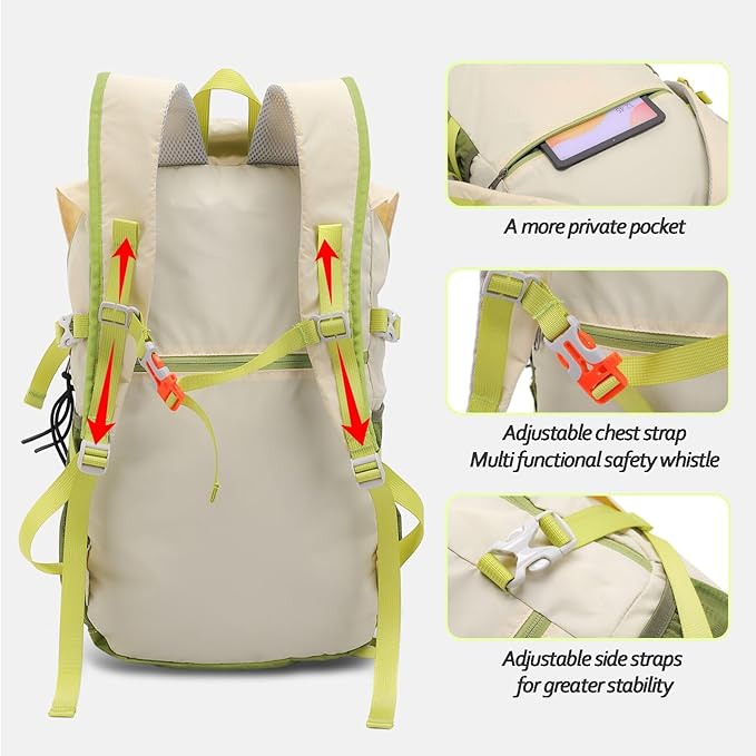 - Exclusive Patented Design: The hiking bag adopts a proprietary ergonomic structure that blends functionality with sleek aesthetics. Adjustable side straps secure water bottles or umbrellas, while a front elastic nylon webbing holds clothes/towels. The 3D breathable mesh shoulder straps, 4-point load-stabilizing system, and adjustable chest strap can reduce shoulder pressure and comfortably distribute weight. A built-in emergency whistle on the chest strap provides instant help when needed.