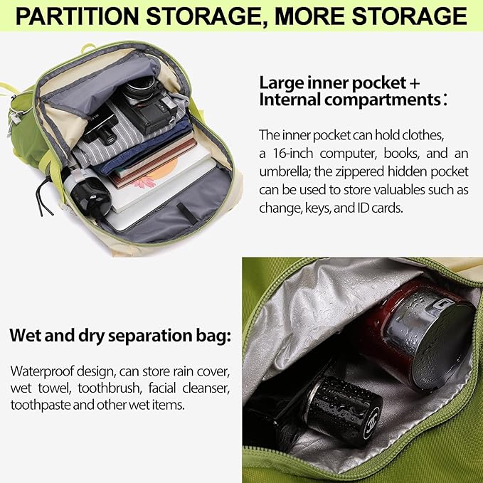 - Multi-compartment Organization: The Seektop hiking bag’s 8 pockets (5 with zippers) offer modular storage. A spacious main compartment fits laptops and clothing. The main zipper pocket can hold a computer and clothes, while top/back zippered pockets safeguard cash, cards, and passports. Two side mesh pockets that can hold water bottles or umbrellas. Waterproof wet pocket with TPU sealing layer (IPX4 waterproof) can independently separate dry and wet clothes.