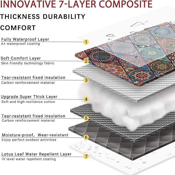 - [7-Layer Structure]This picnic mat features an advanced 7-layer structure design, with a soft cotton layer in the middle that provides excellent cushioning. This ensures a comfortable sitting and lying experience during outdoor activities. Whether you're on grass, sand, or using it indoors, it offers ample support.