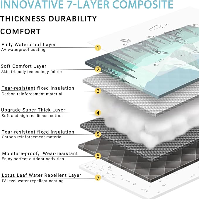 - [7-Layer Structure]This picnic mat features an advanced 7-layer structure design, with a soft cotton layer in the middle that provides excellent cushioning. This ensures a comfortable sitting and lying experience during outdoor activities. Whether you're on grass, sand, or using it indoors, it offers ample support.