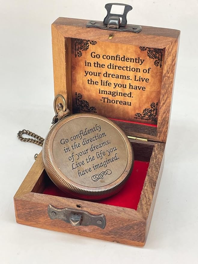 - 🌟FAMOUS QUOTE: Solid Sundial Compass with any Engraving you Want. It Custom with a Good Quote “Go Confidently in the Direction of Your Dreams. Live the Life you have Imagined”. Kala Pocket Sundial Compass Comes with Chain and Handcrafted Wooden Box as shown in the Picture.