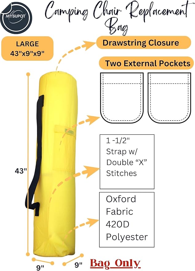 - Keep your favorite chair by purchasing this bag. Bag can also be used for hammock, yoga mat, tents, and collapsibale umbrella. See bag dimensions for details to fit what you need.