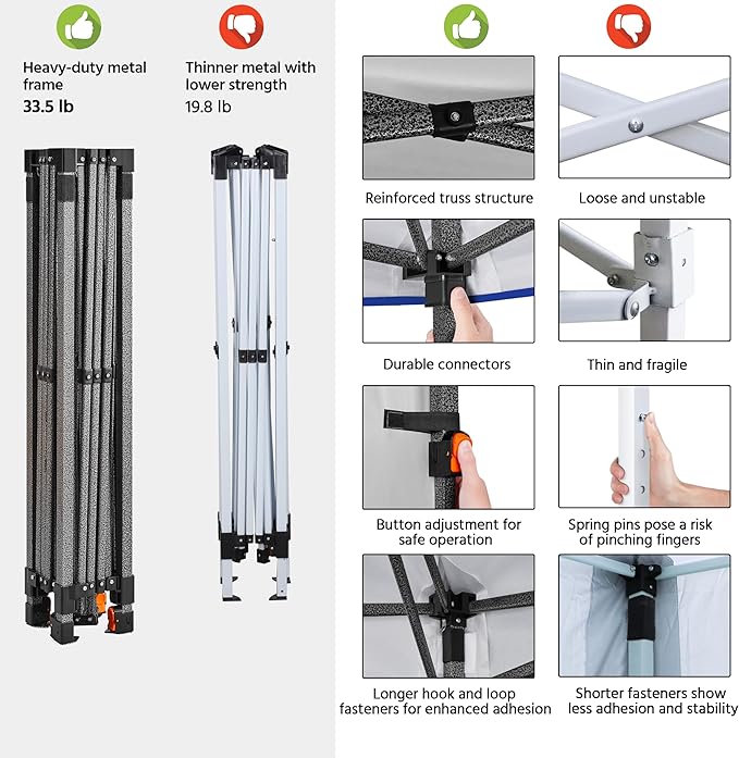 - Effortless & Secure Height Adjustment: Easily adjust the height of this pop-up canopy to 8.6′, 8.9′, or 9.2′ with the simple push of a button. The upgraded mechanism ensures smooth, secure operation, giving you full control to customize your space