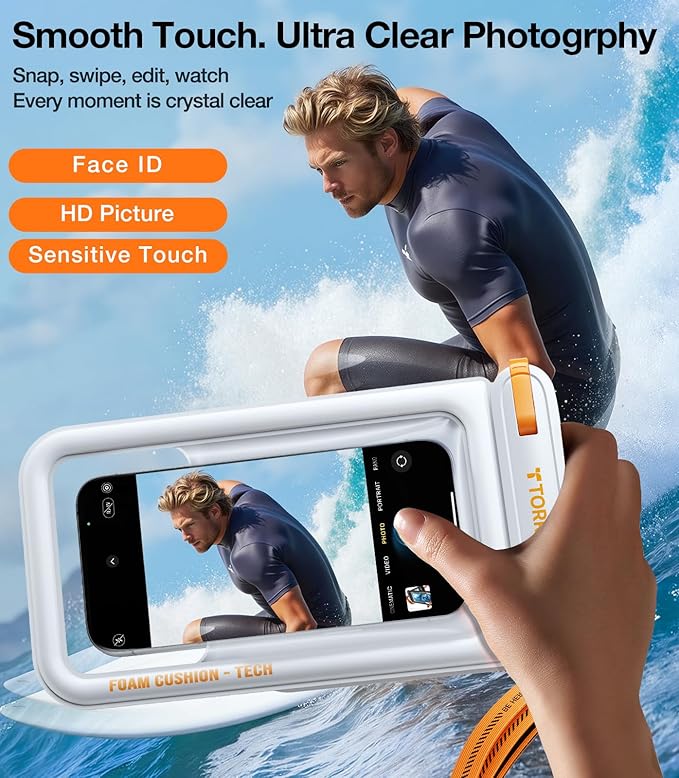 - Clear Photography, Sensitive Touch: Made of high-transparency 95A TPU, it ensures a high-definition effect like a bare phone. The independent "photography window" allows you to clearly capture every wonderful moment of water activities and record the underwater wonders during snorkeling; the "large window" gives you a crystal-clear screen and sensitive touch operation. You can easily edit messages, use Face ID, and make Facetime calls without removing your phone from waterproof bags