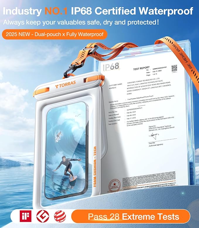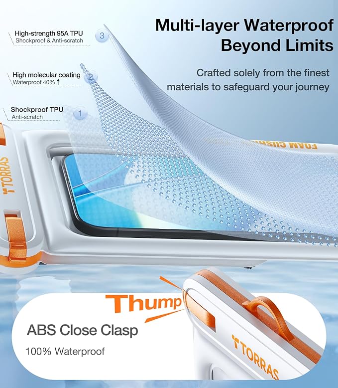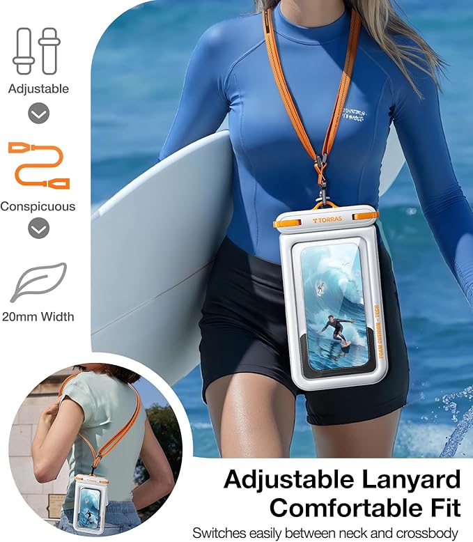 - Dual Pouch, Double Storage: In 2025, TORRAS launched an innovative Dual-Pouch Waterproof Phone Pouch, providing double separate storage space. It keeps items neatly stored and solves the problem of daily items being messy and having no place to be put. The large pouch fits up to 7.0-inch phones. And the small pouch stores cards, cash, earphones, and keys, preventing phone-item scratches. Its white back design protects your privacy, allowing you to enjoy every happy journey without worry!