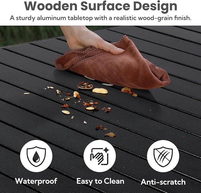 - Easy to Clean: The painted aluminum tabletop is waterproof, dirt-resistant, and rust-resistant. It is easy to clean and will not fade. Watermarks and oil stains will not be absorbed, so you can rinse and wipe it directly with water without affecting the appearance or durability of the folding table.