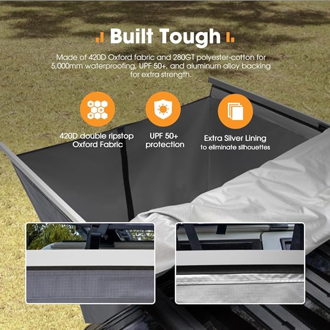 - Built for Tough Conditions: We built it with tough 420D Oxford fabric and 280GT polyester-cotton, so it’s not only durable but also waterproof with a 5,000mm rating. Plus, our shower tent offers UPF 50+ sun protection, and the aluminum alloy backing adds extra strength to make sure it holds up. And when you’re done, just fold it up and store it in the UV-resistant, waterproof 1,680D Oxford fabric travel cover.