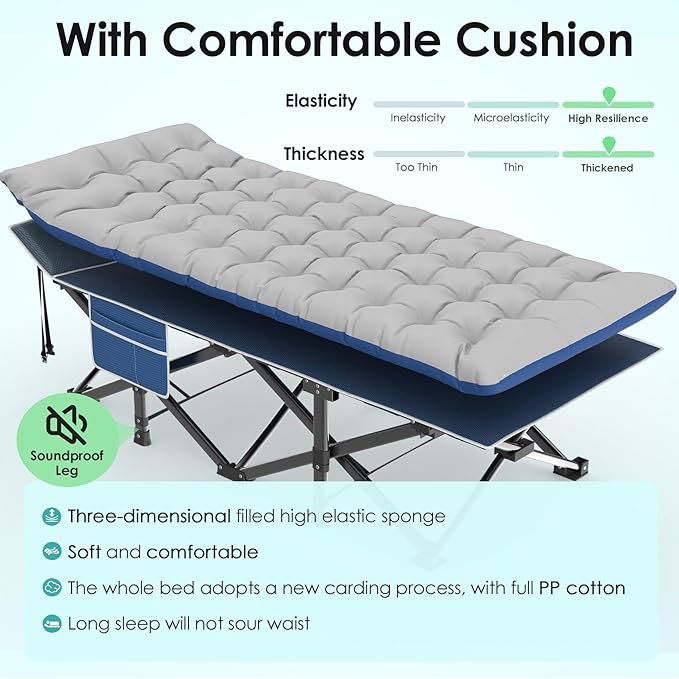 - 【Removable Skin-Friendly Mat】Our camping bed cot for adults has a soft and removable Mat, the 4" thicken cushion makes you more comfortable and warm when resting or sleeping. The cushion is made of skin-friendly and comfortable fabric, which is very suitable for people with sensitive skin or kids. You can also remove the mat when the weather is hot,and tie it up with the strap in it