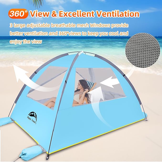 Happy Travel Beach Tent, UPF 50+ UV Protection Sun Shade Shelter for 3/4/5/6/7/8 Person, Portable Beach Canopy for Family & Baby, Lightweight & Easy Setup Beach Cabana with 3 Ventilation Mesh Windows