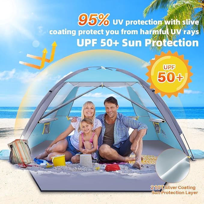 - 【UPF 50+ Protection】Happy Travel beach shade canopy is made of a special sliver coated 210T taffeta cloth that not only reflects and absorbs sunlight but also waterproof. It effectively blocks up to 95% of harmful UV rays and reduces the temperature inside the beach tent. And we added an extra layer of silver-coated reinforcement to the inner layer for better UV protection, so this beach tent is also for babies and toddlers, which is beach must haves gear for your family.