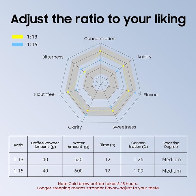 - Effortless Brewing Perfection: This cold brew pitcher makes cold brew coffee simple. Fill the reusable filter with your favorite coffee grounds as you prefer. Pour in cold water and steep overnight (8-15 hrs), and enjoy smooth, low-acidity cold brew exactly to your taste (Note: Adjust coffee-to-water ratios for custom strength.)