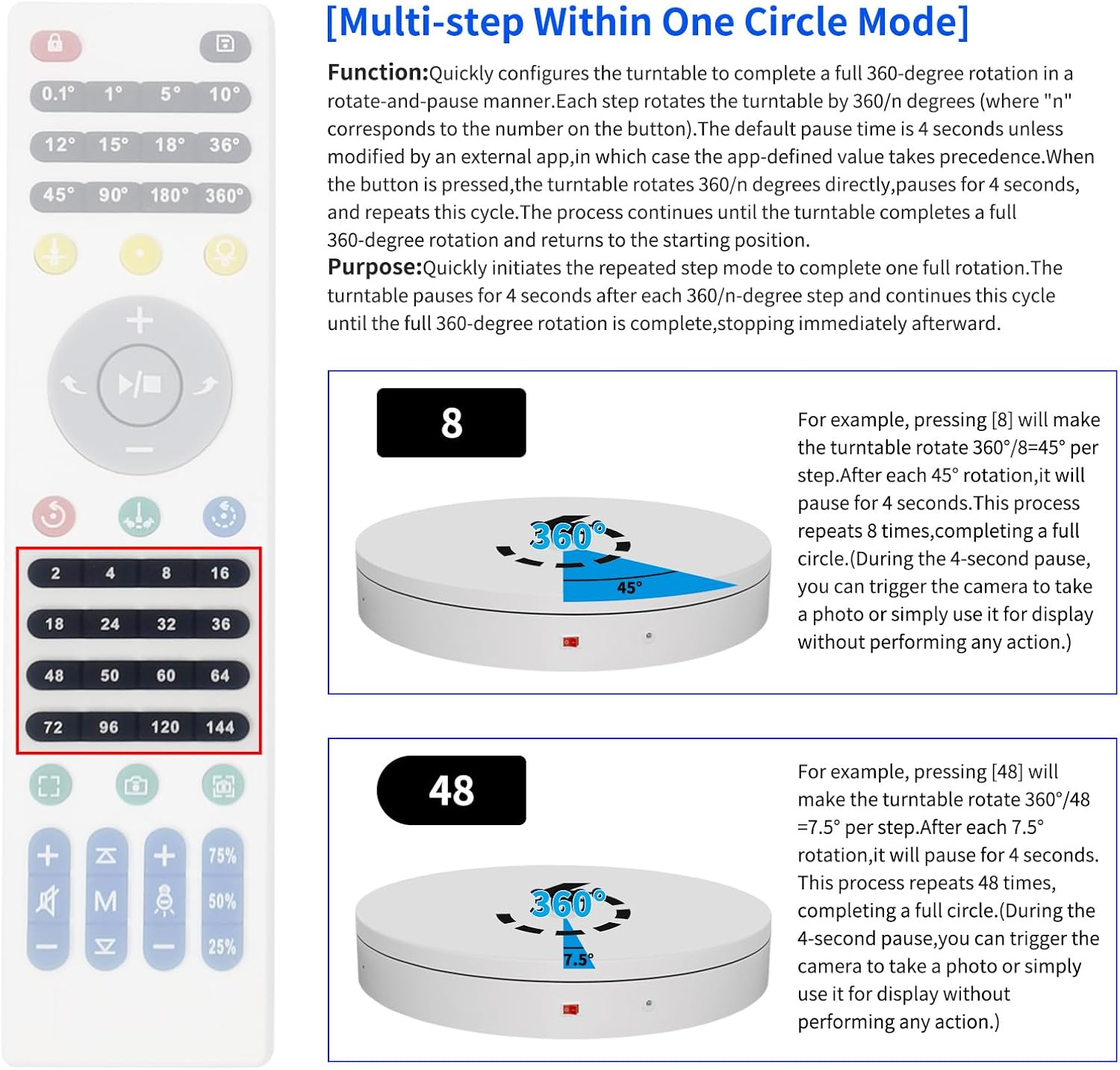 - 【The Electric Turntable Supports five rotation modes】: 【Continuous Rotation Mode】for Live Video Show.【Single-Step Mode】for Product Display and Live Demonstration.【Repeated Step Mode】 for Automated Product Display .【Multi-step Within One Circle Mode】for 360-Degree Multi-Angle Photography and 3D Scanning. 【Pendulum (Swing) Mode】 for Automatic Multi-Angle Front-and-Back Product Display. The intelligent multi-step within one circle mode makes shooting more streamlined and automated