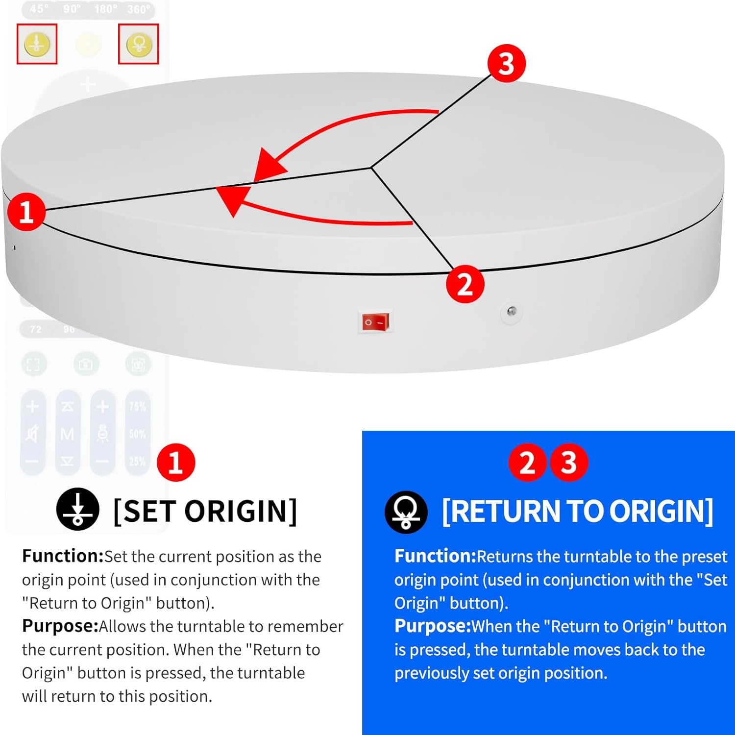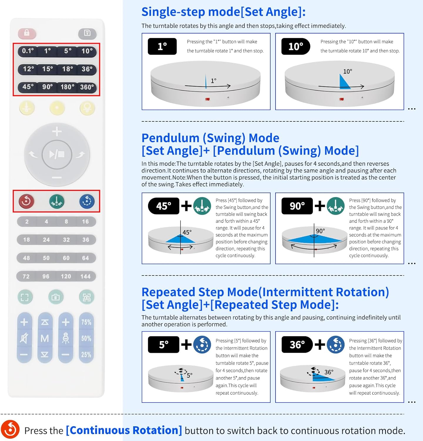 - 【This Large Rotating Platform includes a Professional Flagship Remote Controller】:Precise angle settings and user-friendly combination key design enable support for a wider range of applications. Support: Set the current position as the origin point (used in conjunction with the "Return to Origin" button). Support: Save the current settings to the turntable's internal flash. More versatile angle buttons and mode button combinations provide greater flexibility for various applications