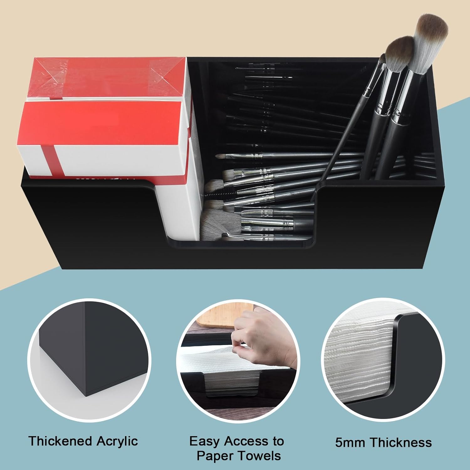 - Durable Acrylic Material:The paper towel dispenser is made of 5mm black acrylic material, sturdy and durable, not easy to break, and the sides are well polished and smooth, no need to worry about falling and scratching your fingers at all.