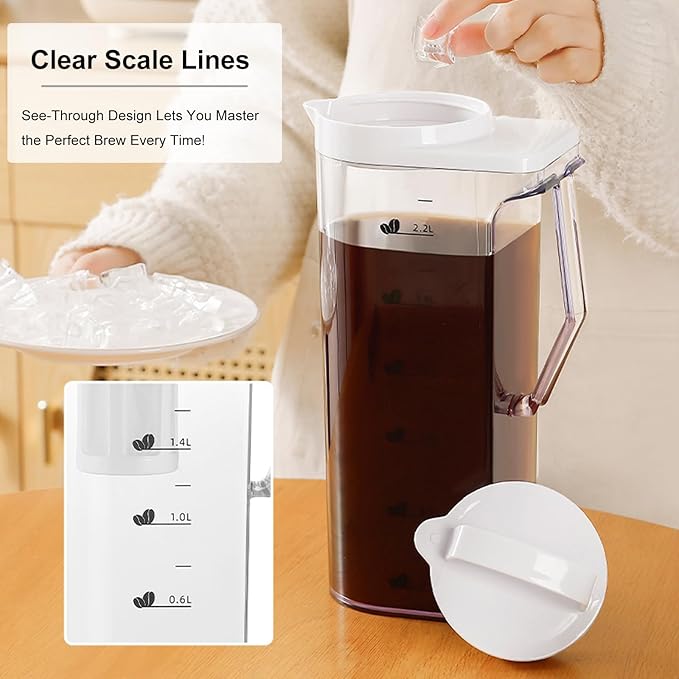 - Mess-Free 74oz Large Capacity: Brew days worth of smooth, cold-brewed coffee at a time! Our 2.2 liter (74 oz.) heat-resistant plastic brewer serves 4-6 coffee lovers and is perfect for families, parties, or saving time on busy mornings. No more daily coffee refills!