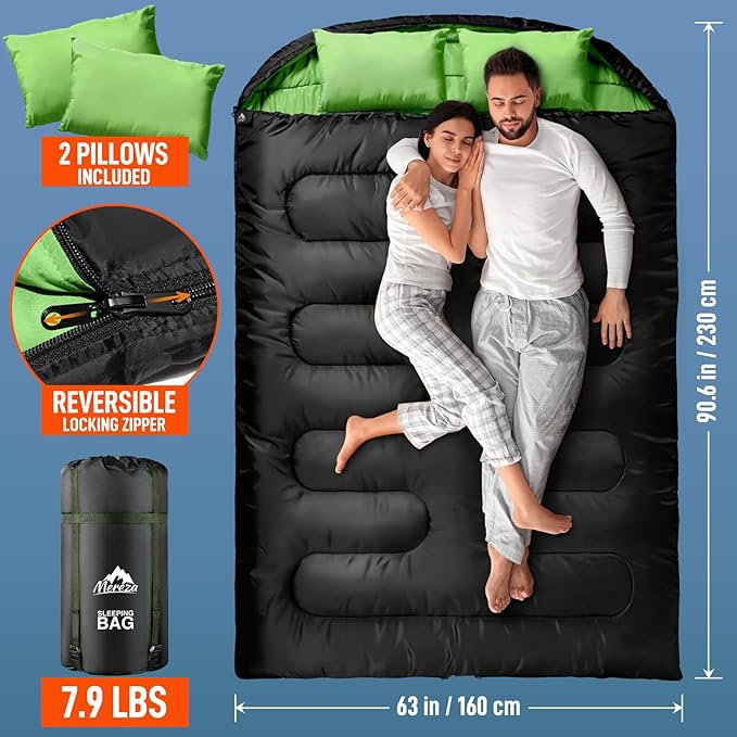 MEREZA Double Sleeping Bag for Adults Mens with Pillow, XL Queen Size Two Person Sleeping Bag for All Season Camping Hiking Backpacking 2 Person Sleeping Bags for Cold Weather & Warm