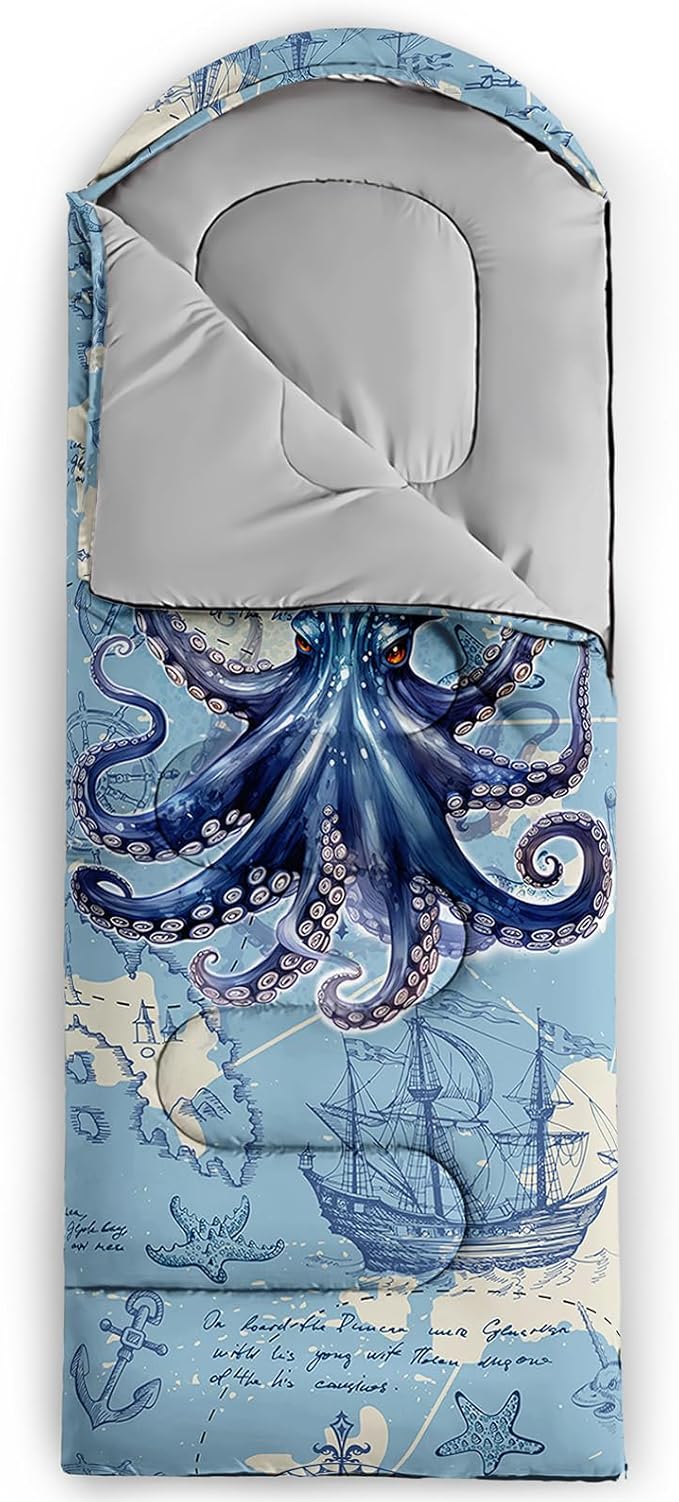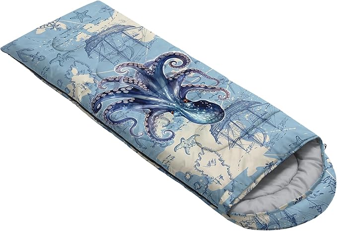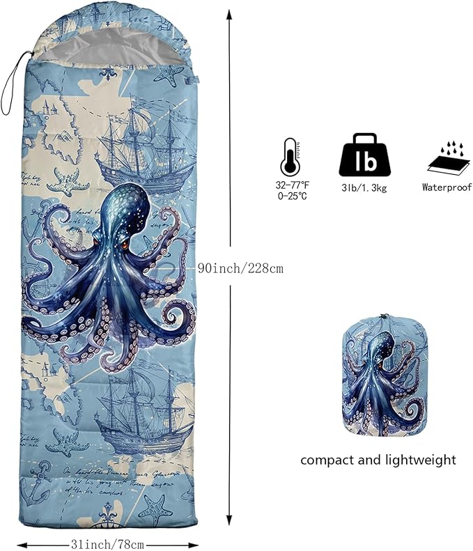 - Unique Octopus Design:This Octopus pattern sleeping bag is made of 3D digital printing with vibrant colors and patterns,size: 31W x 90L inches,temperature range: 32℉-77℉ (0℃-25℃),it also also have a weather resistant waterproof design to keep you warm and prevent you from any dampness,can be used in 3 seasons