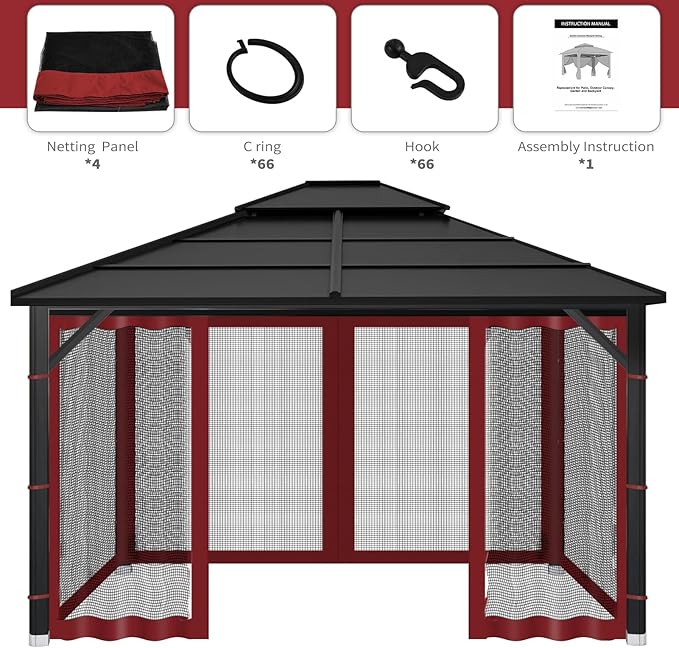 - 【EASY INSTALLATION】Inserting the rings or hooks into the netting loops and hang over existing frame of gazebo. We also provide with an instruction for you