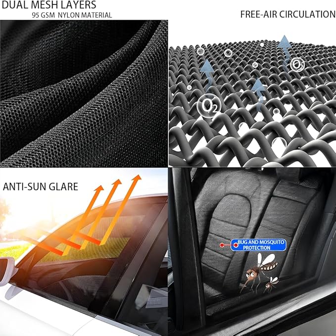- UPGRADED UV,BUGS AND MOSQUITO PROTECTION: Our car window screen shade is made from durable nylon mesh that is breathable, stretchable, and provides complete privacy blackout. Designed to keep your children from UV, Bugs and Mosquito, it's also a great car window screen for camping.