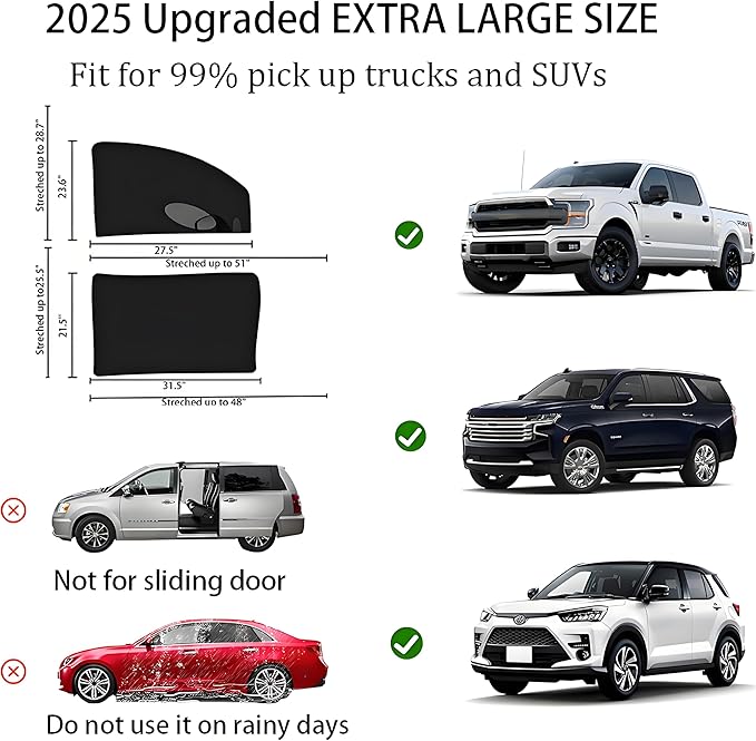 - LARGE WINDOW SCREENS:With the updated size and super elastic spandex material,these window sun shades stretch freely. FRONT Screens Length: Min 27.5" - Max 51"; Height: Min 23.6" - Max 28.7".REAR Screens Length: Min 31.5" - Max 48"; Height: Min 21.5" - Max 25.5" Suitable for most pickups, commercial vehicles, SUVs, vans.