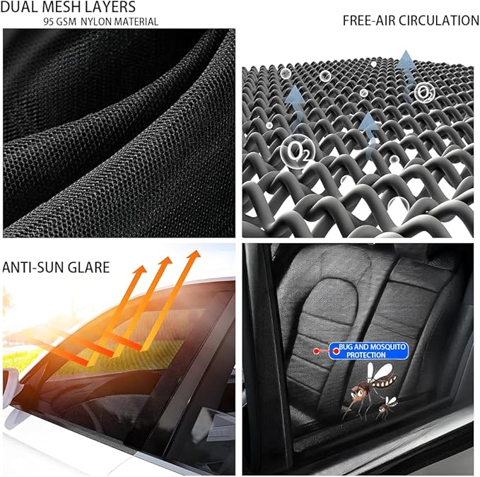 - UPGRADED UV,BUGS AND MOSQUITO PROTECTION: Our car window screen shade is made from durable nylon mesh that is breathable, stretchable, and provides complete privacy blackout. Designed to keep your children from UV, Bugs and Mosquito, it's also a great car window screen for camping.
