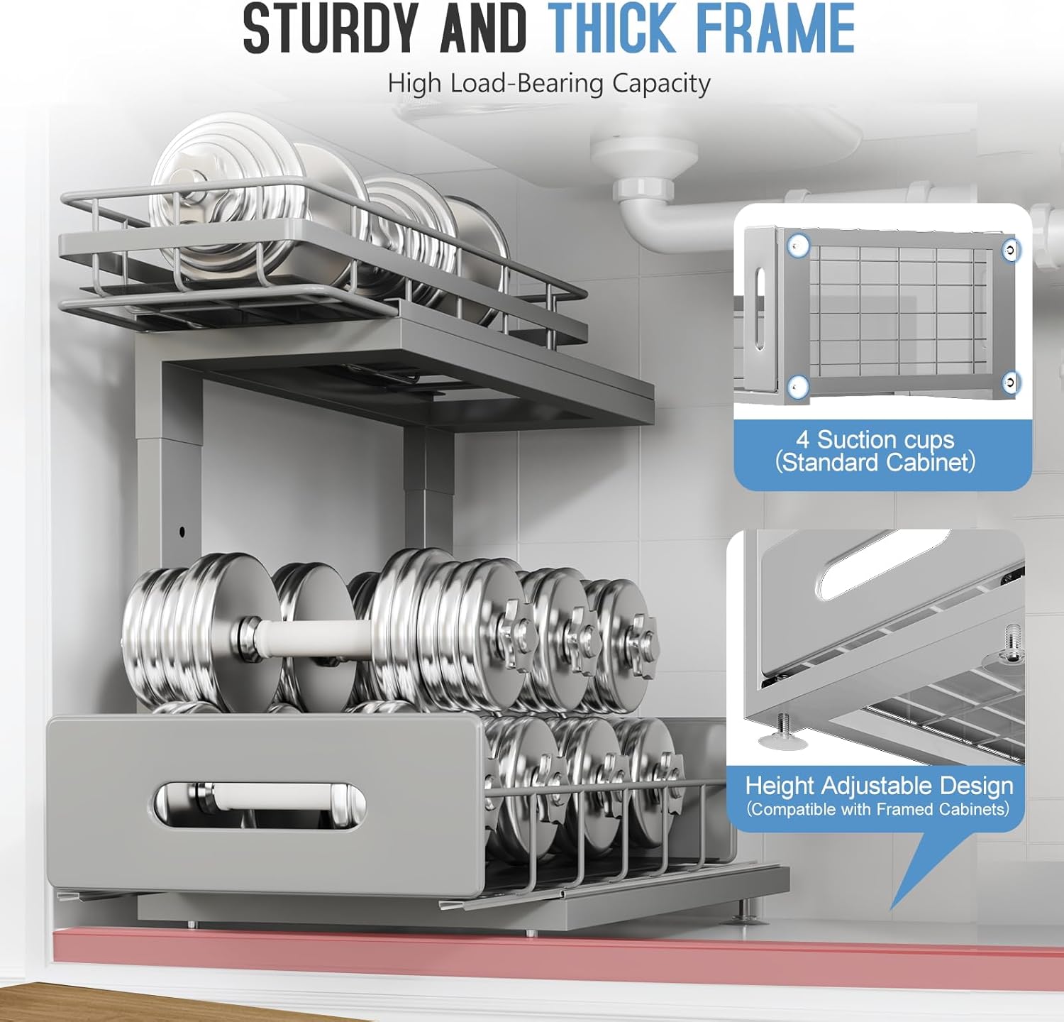 - 【Height Adjustable for Custom Fit】Customize the height of each tier to fit items of varying sizes and adapt to different cabinet heights. Perfect for organizing tall bottles, cleaning supplies, or toiletries under your sink, while providing a versatile storage solution that fits both small and large under-sink spaces in your kitchen and bathroom.