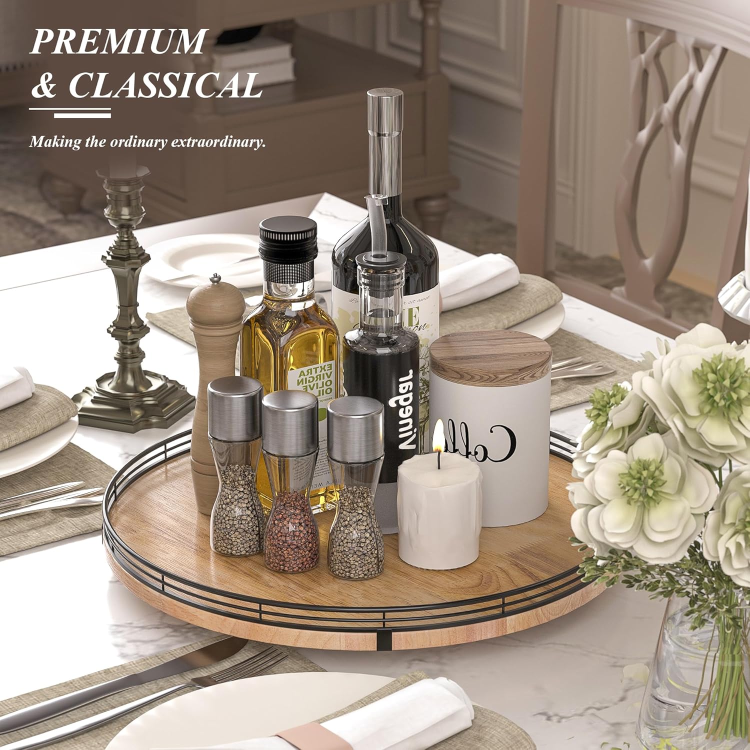 - PREMIUM MATERIAL: Our farmhouse lazy Susan organizer is made of natural solid oak wood and strong metal, sturdy, durable and premium quality. This wooden turntable organizer is a game-changer for keeping your kitchen organized. The farmhouse oak finish gives it a rustic, charming look that will fit perfectly with your kitchen decor.