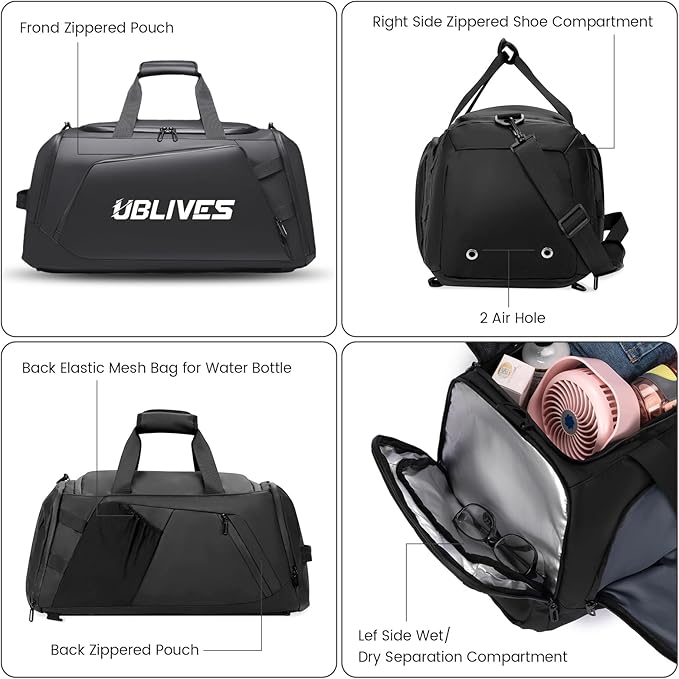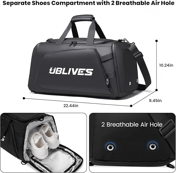 - Independent Shoe Compartment & Hygienic Wet-Dry Separation: The right side of this gym bag features an independent shoe compartment with 2 ventilation holes for air circulation and odor control. The shoe compartment is lined with waterproof material, effectively isolating odors and moisture. The left side features a waterproof wet/dry separation pocket, perfect for storing wet swimsuits, towels, and more, keeping the main compartment dry and clean. This makes it the ideal gym duffel bag choice that meets all your needs.