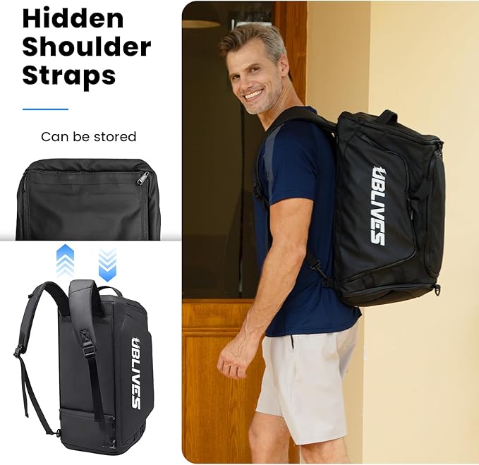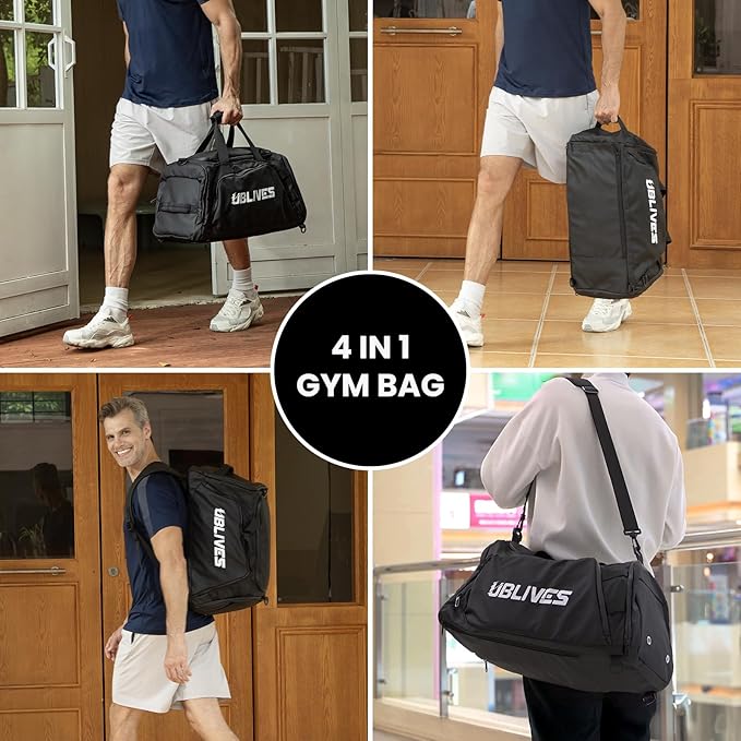 - 4-in-1 Multi-Purpose Gym Bag/ Travel Duffel Bag/ Backpack/ Crossbody Bag: This multi-functional gym bag offers handbag, vertical duffel, backpack, and crossbody 4 carrying options, featuring hidden backpack straps and removable shoulder straps, hidden backpack straps keep the look clean and streamlined, while the detachable shoulder strap features a breathable mesh pad for extra comfort and reduced pressure. This gym bag is perfect for gym workouts, business travel, and outdoor adventures. The versatile design makes it your ultimate travel bag and duffel bag for any occasion.