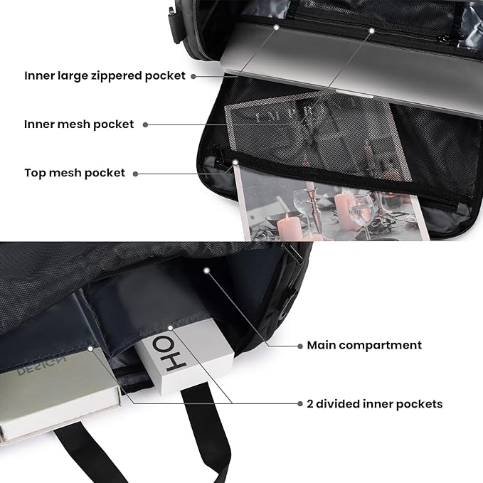 - Large Capacity with Multiple Compartments: This Gym bag is designed for high-capacity storage with smart organization, interior includes a top mesh zipper pocket, a large inner zipper pocket with additional mesh pocket, and two side dividers. On the outside, there's a front zipper pocket, plus a rear mesh pouch and zipper pocket—quick access to your essentials on the go, really a perfect gym duffel bag which will keep your belongings organized and accessible.