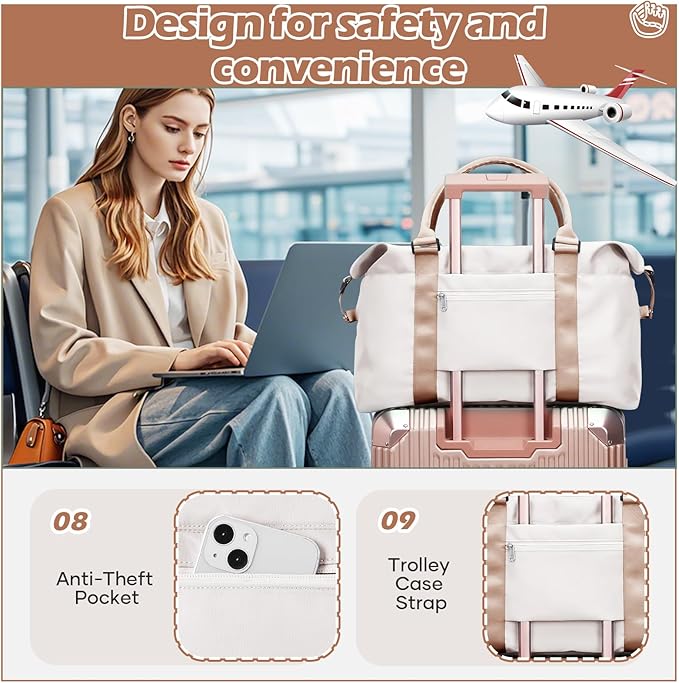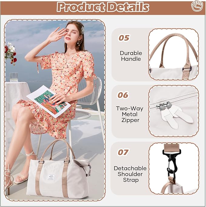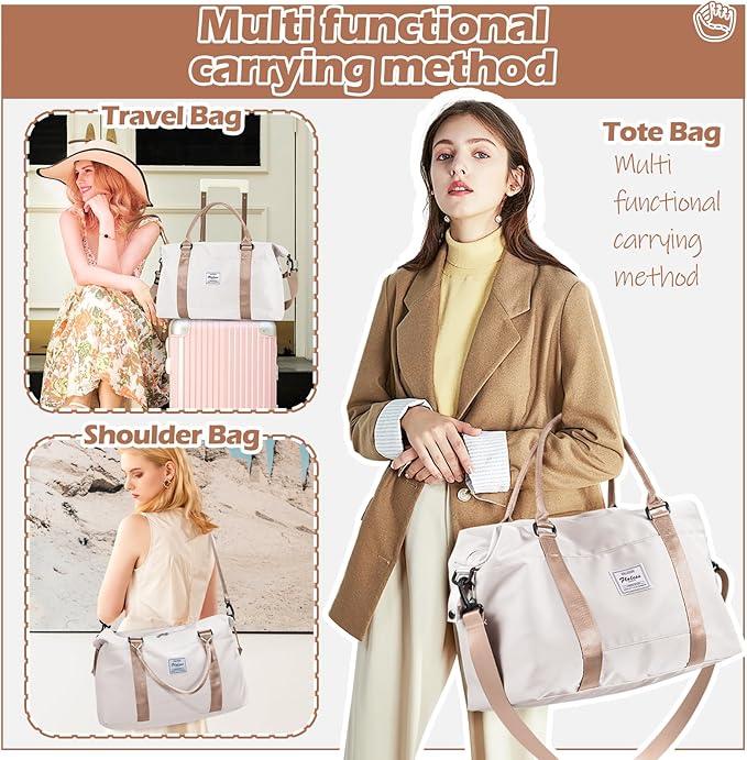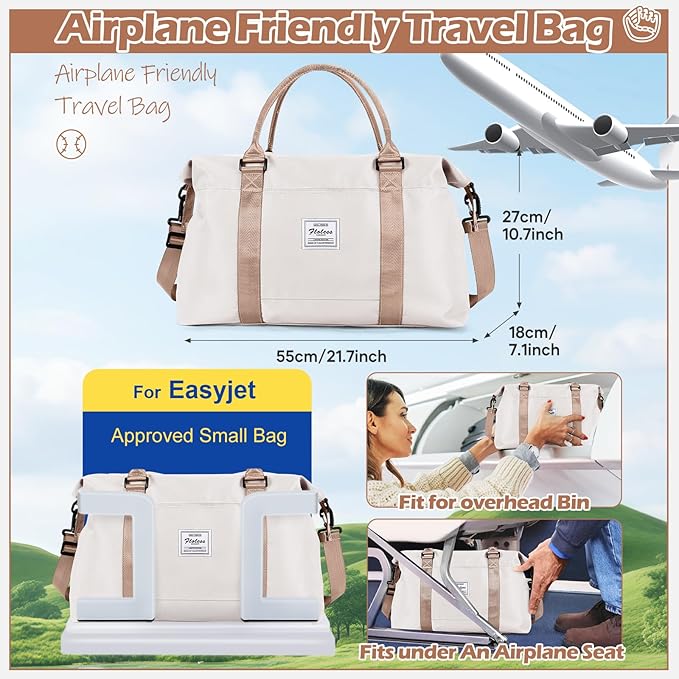 - 【Large and Multiple pockets Overnight bag】This overnight bag has six multiple internal and two external organizational pockets,which ensure you have a place for everything.The dimensions of the overnight bag for women are 10.63"*21.65"*7.09".You can carry it onto an airplane. Large storage space for a clothes for short trip. It has a capacity of 30L and can hold 6 to 8 pieces of summer clothes,Cosmetics, toiletries, wallets, keys, earphones, mobile power, mobile phones, files.