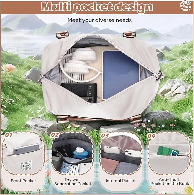 Gym Bag Womens Mens with Wet Pocket, Travel Duffel Bag for Plane, Sport Gym Tote Bags Swimming Yoga, Waterproof Weekend Overnight Carry on Bag Hospital Holdalls,Off White