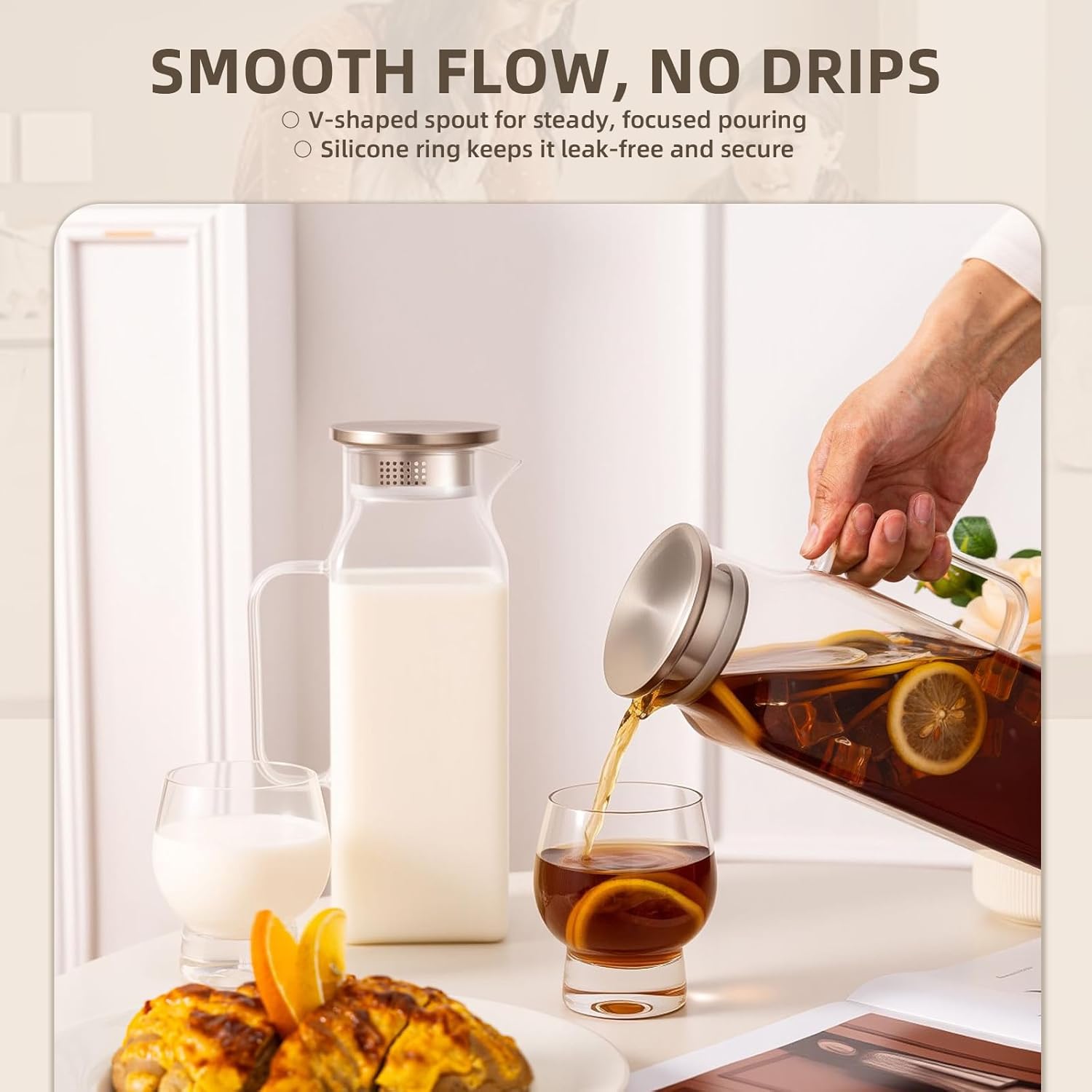 - Large capacity with elegant design: this 68 ounces large glass pitcher helps you save time, as you don't have to refill it as often. Please check your refrigerator shelf size before purchasing. This pitcher may not fit all fridges.