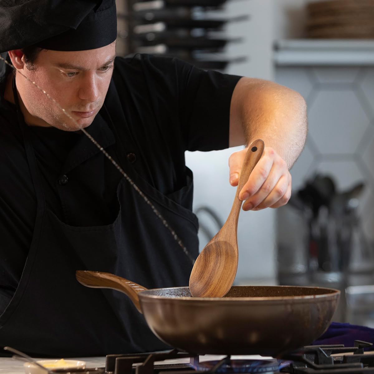 - 【ERGONOMICALLY DESIGNED】 13-Inch in length, these wooden salad servers are long enough for hot soup serving with no worry about scalding your hands, and large enough to stir and flip your yummy foods in big pans and pots. Ergonomically designed, these salad spoon and spork are with wide and comfortable handle, comfortable to hold and grip, and with hanging holes at handle rear for easier storage. And the teak wood is with a tight grain and rich color that make each of them look unique, perfect to decorate your kitchen.