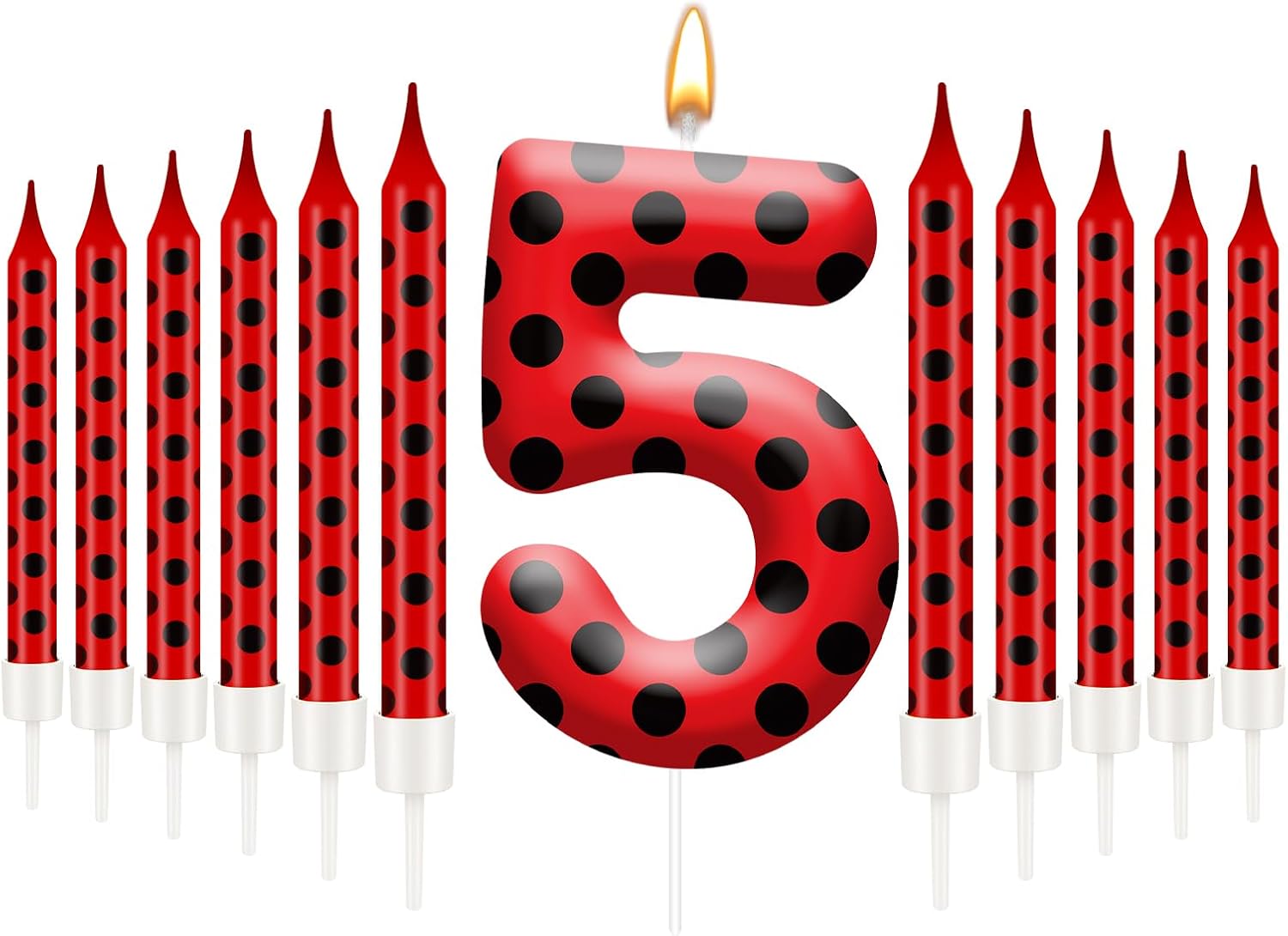 - Vibrant Ladybug Design: You will receive 12PCS and 1 number 5 Ladybug themed birthday candles AXBMM Ladybug Theme Birthday Candles feature bold red and black polka dots. These candles burn cleanly and evenly, adding whimsical charm to any ladybug-themed party or celebration