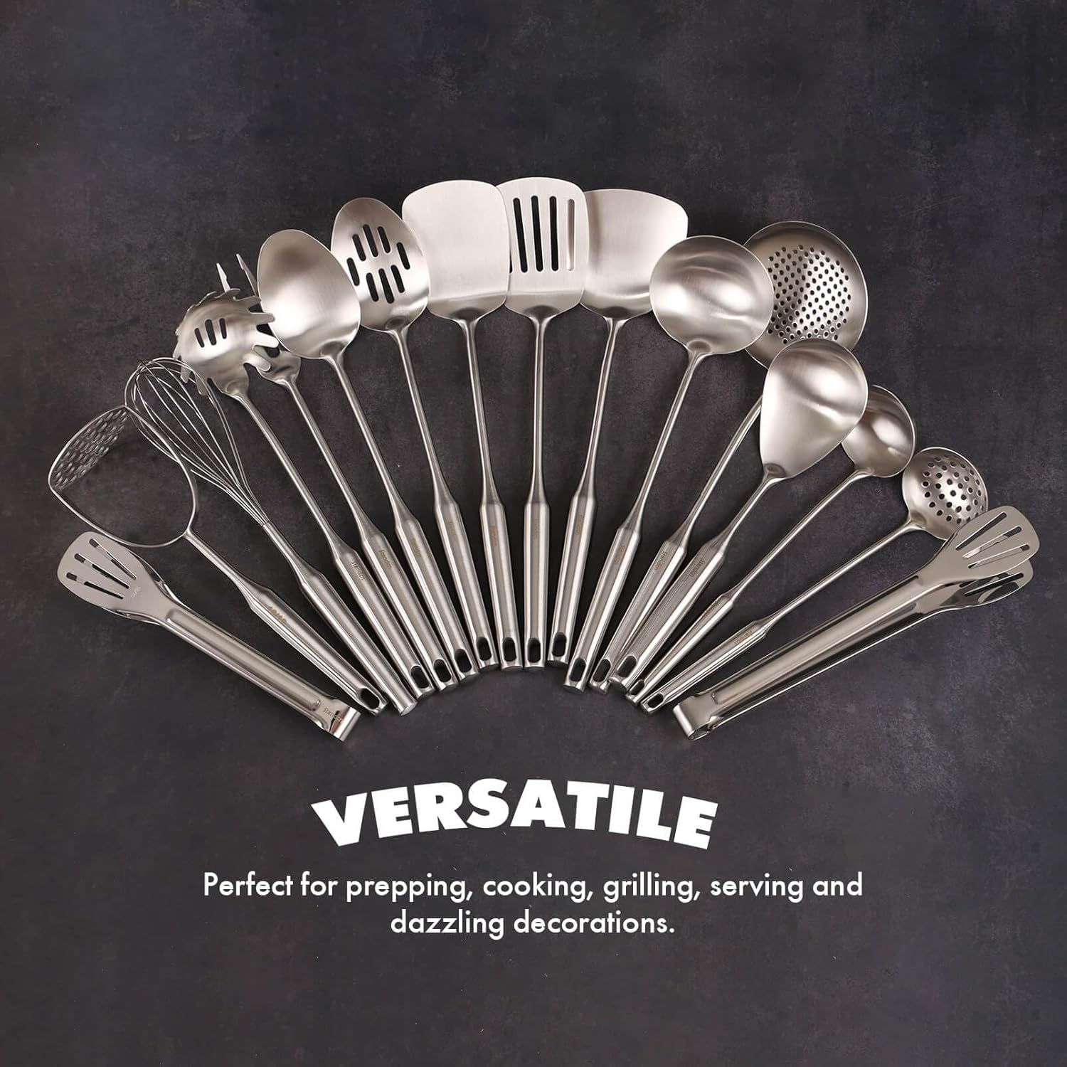 - 【Versatile Utensils Set of 16】: 16-Pieces, 2 tongs, 1 whisk, 1 potato masher, 1 meat fork, 1 slotted spatula turner, 1 solid spatula turner, 1 solid serving spoon, 1 slotted serving spoon, 1 wok spatula, 1 skimmer spoon, 1 large spoon, 1 spaghetti server, 1 soup ladle, 1 small soup ladle, 1 small slotted spoon. These premium utensils are safe to use for cooking any type of food, a complete complement to carbon steel, cast iron woks.etc