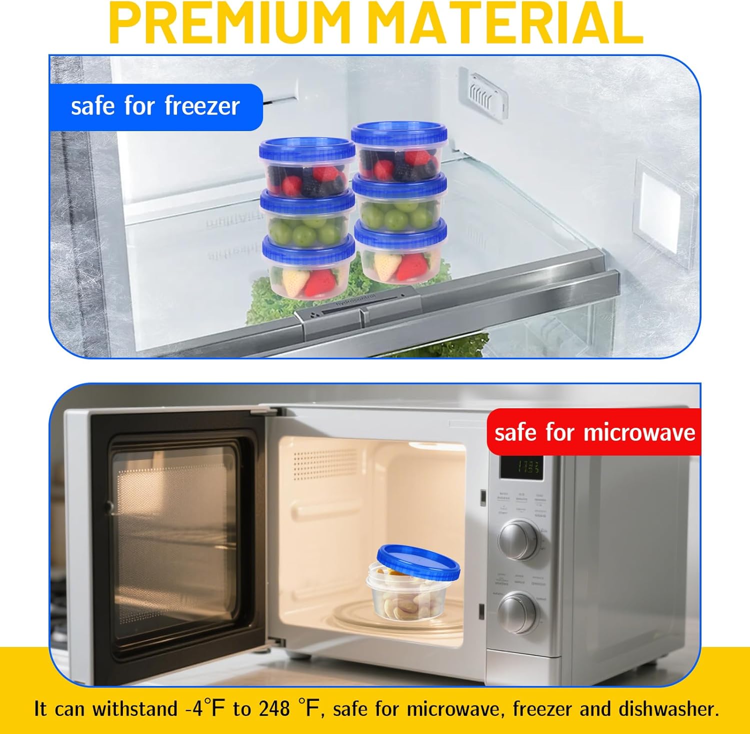 - Size: The size of the plastic freezer containers with lids are are 9.7 x 6 x 8.5 cm / 3.8 x 2.36 x 3.35 inch ( Top Dia. x H x Bottom Dia.) and the capacity is 8 ounce (1 cup).