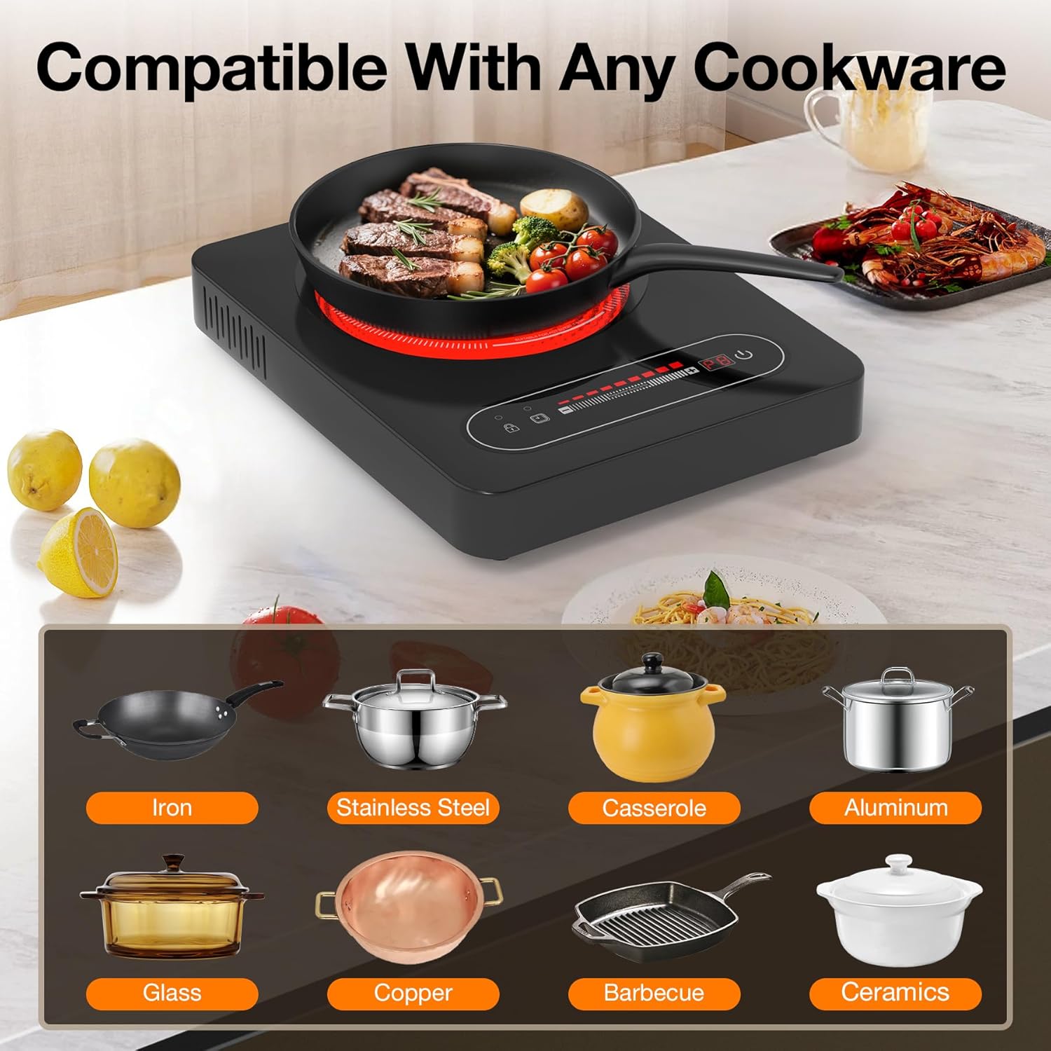 - Electric Cooktop for All Cookware Types: The scratch-resistant electric stove top accommodates cast iron, stainless steel, ceramic, glass, and non-stick pans evenly. Spills wipe clean in seconds – no stubborn stains, perfect for daily use as a countertop stove or backup electric stove top