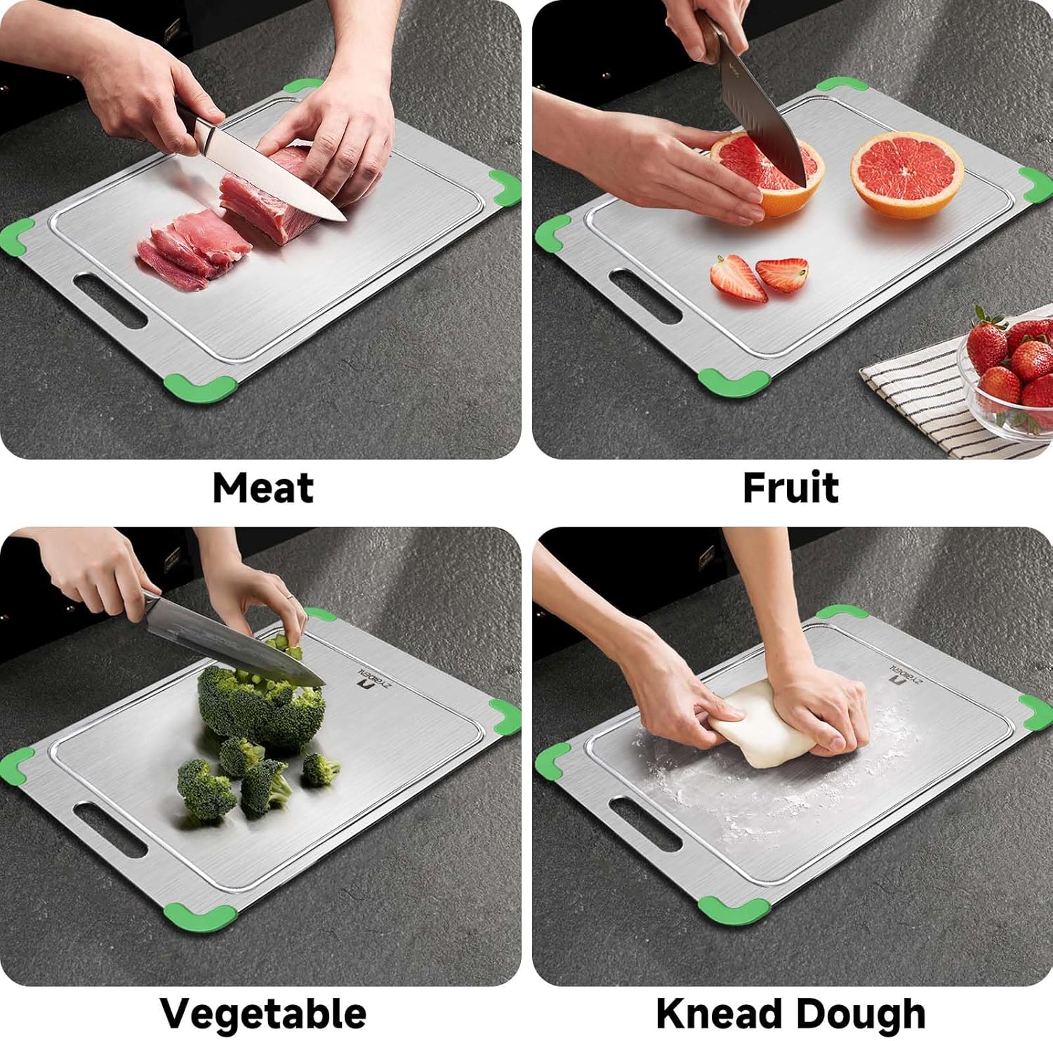 100% Pure Titanium Cutting Board with Grooves, Update Double Side Titanium Chopping Board, Silicone Anti-slip Stainless Cutting Boards for Kitchen 9 * 13 IN, Green