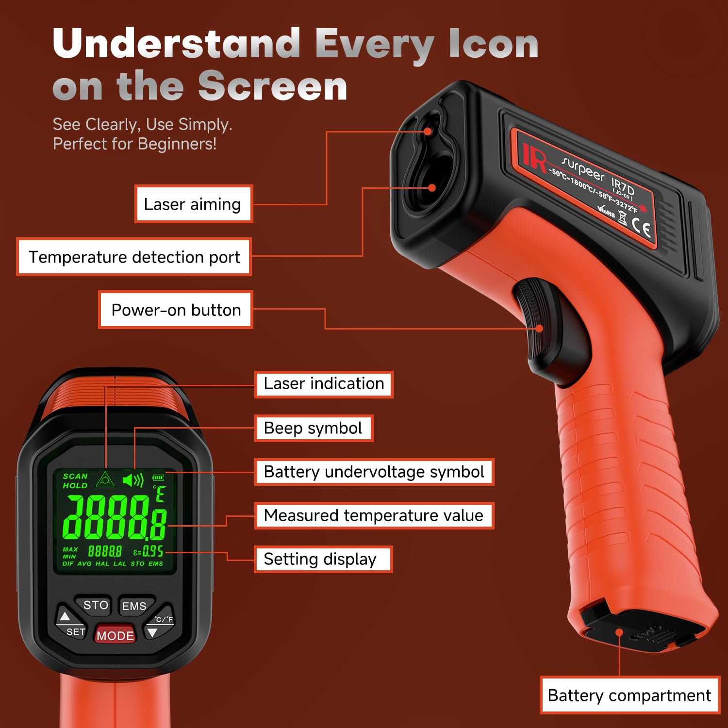 - Professional Support with Guaranteed Reliability: SURPEER provides industrial-grade infrared thermometer guns engineered for both professional and household use. Supported by a comprehensive 2-year warranty and 24-hour email technical assistance, we ensure continuous performance and peace of mind. Each unit comes complete with an infrared thermometer gun, a durable toolbox, 2 AAA batteries, and a user manual.