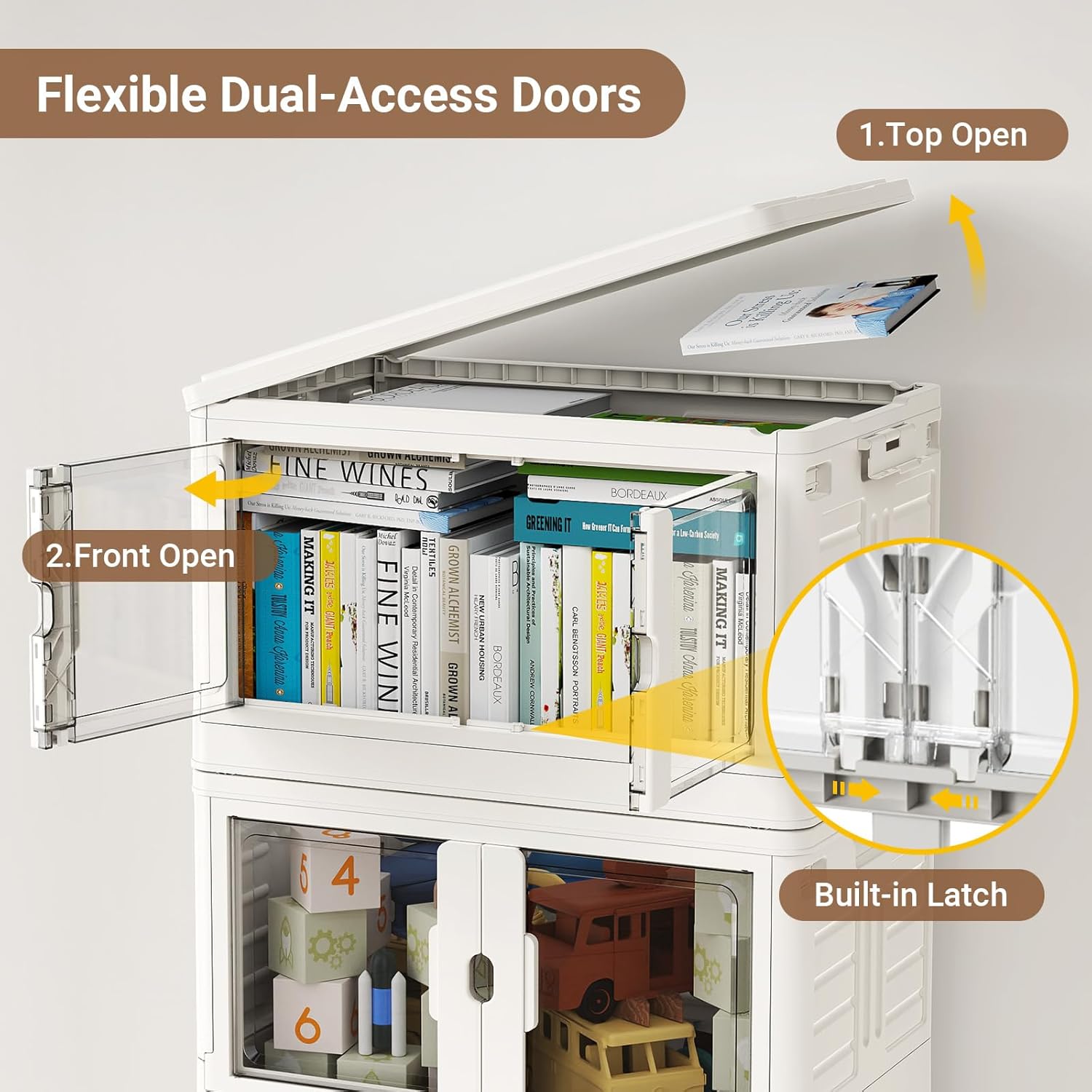 - [Dual Access Ways] Broview plastic storage bins with lids are designed with two opening ways - Front doors or top lid. The handle of the front door has a lock design, the storage cabinet can be locked or unlocked by pressing the handle. The front doors is convenient for daily use, while the top lid allows for quick access to larger items such as clothes and blankets.